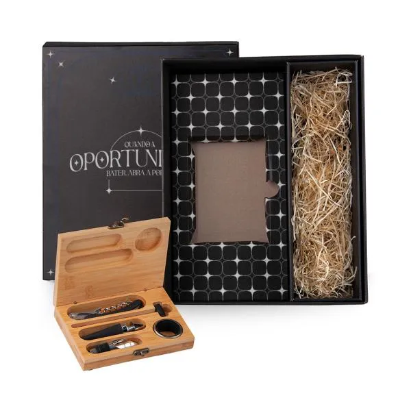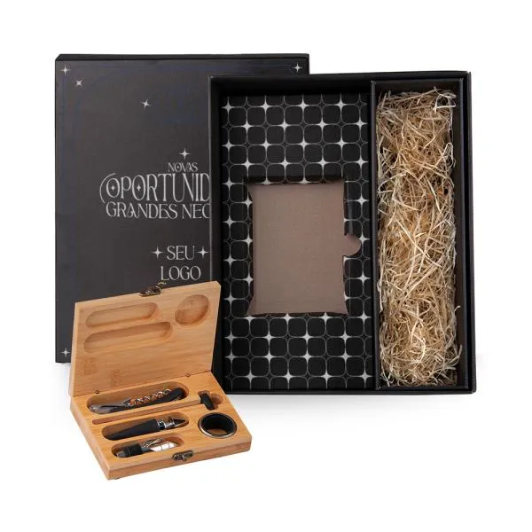 - Personalização: Gravação a laser no estojo em bambu e silk na tampa da caixa