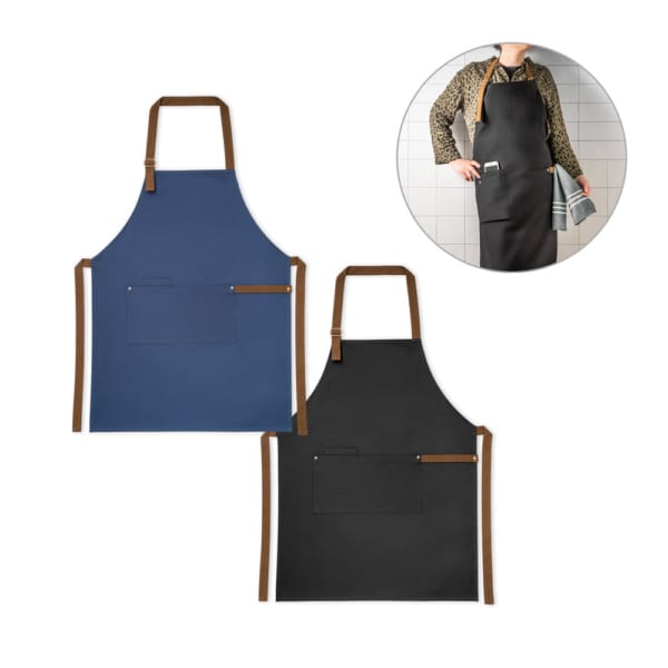 Avental 100% algodão canvas (300 g/m²) com detalhes em metal. Com 3 bolsos multifuncionais e uma tira lateral (para suporte de um pano de cozinha). Tira do pescoço facilmente ajustável
