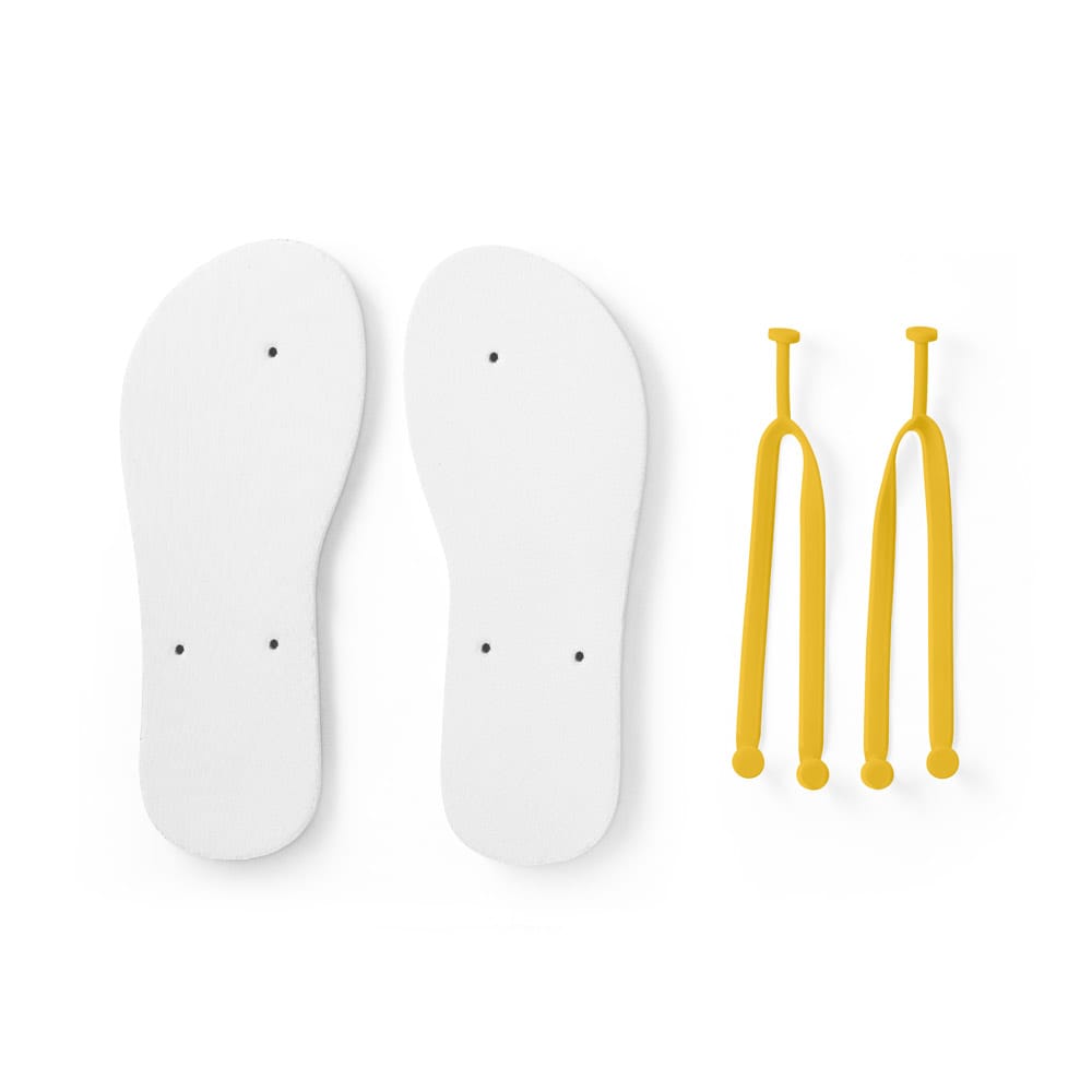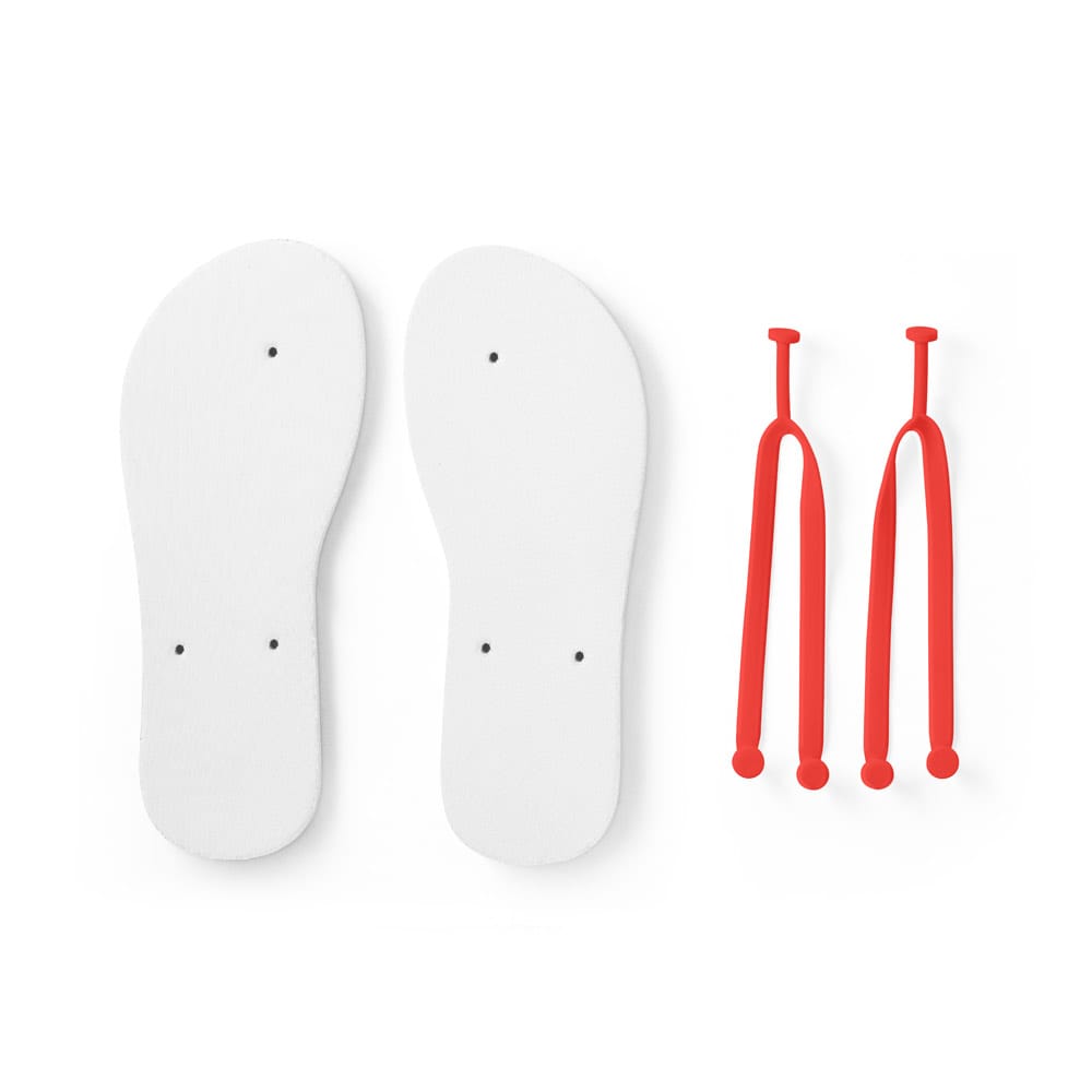 Chinelos confortáveis com sola em EVA e tira em PVC. A sola é totalmente personalizável em sublimação. Tamanhos disponíveis: P/M (36 ao 39). Fornecidos num saco (montados em caso de personalização e desmontados em caso de não personalização)