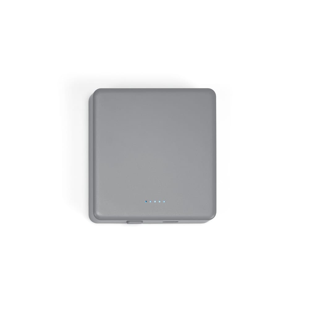 Bateria portátil de carregamento rápido em ABS 100% reciclado com acabamento em mate. A bateria leve em lítio e com design slim, tem uma capacidade de 5.000 mAh e tempo de vida ≥ 300 ciclos. Esta bateria portátil torna-se muito prática para o dia a dia uma vez que permite, através do seu magnetismo, prender atrás dos smartphones ou capas com este sistema. Possui entrada/saída USB-C e potência máxima de 15W para carregamento rápido sem fios. Compatível com smartphones com tecnologia de carregamento sem fios. Incluso cabo USB-C para carregamento rápido. Fornecido em caixa presente de papel kraft reciclado