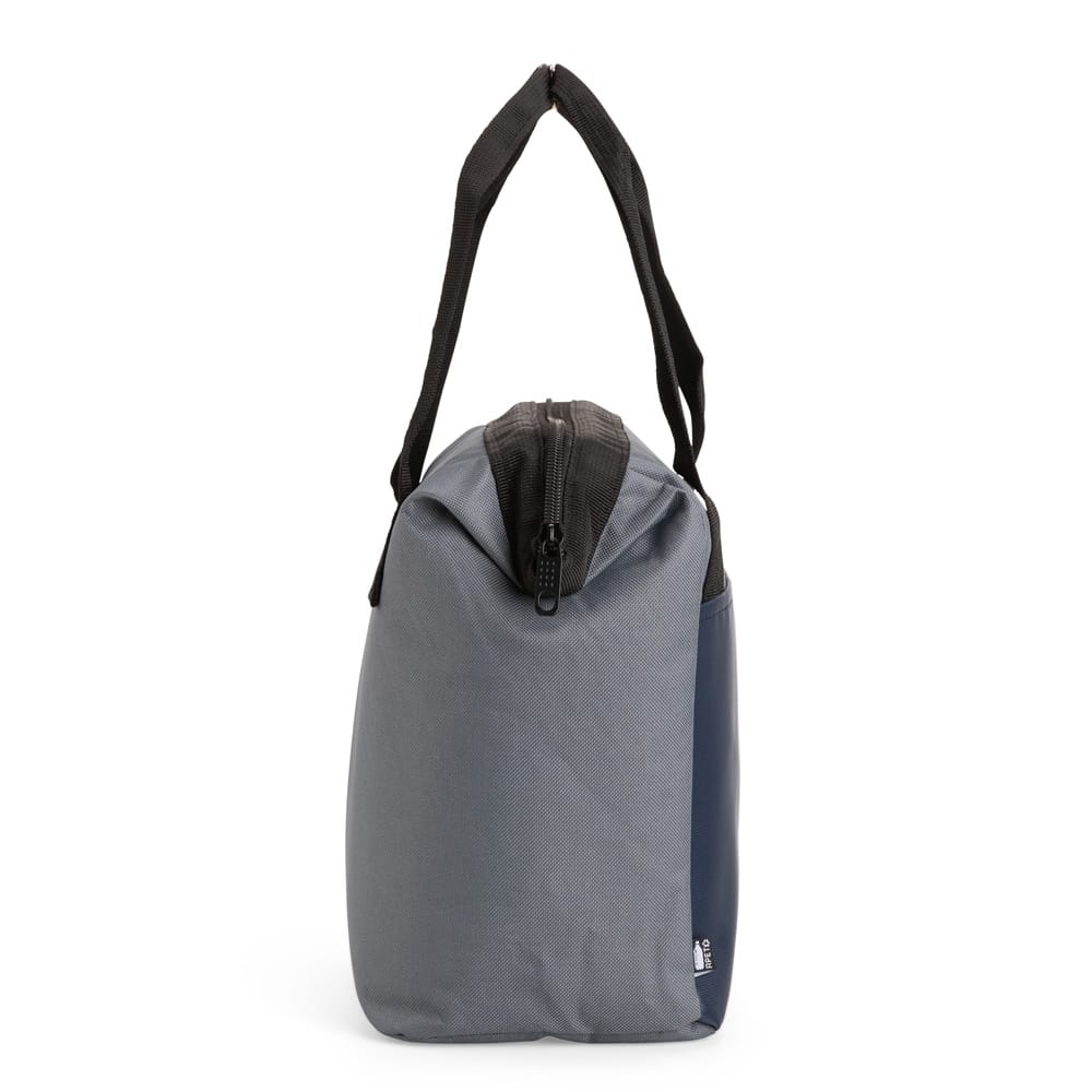 Bolsa térmica em poliéster resistente à água com fechamento em zíper e capacidade para até 7 litros. Possui revestimento térmico antivazamento, bolso frontal em rPET e alças em nylon com botão para junção.