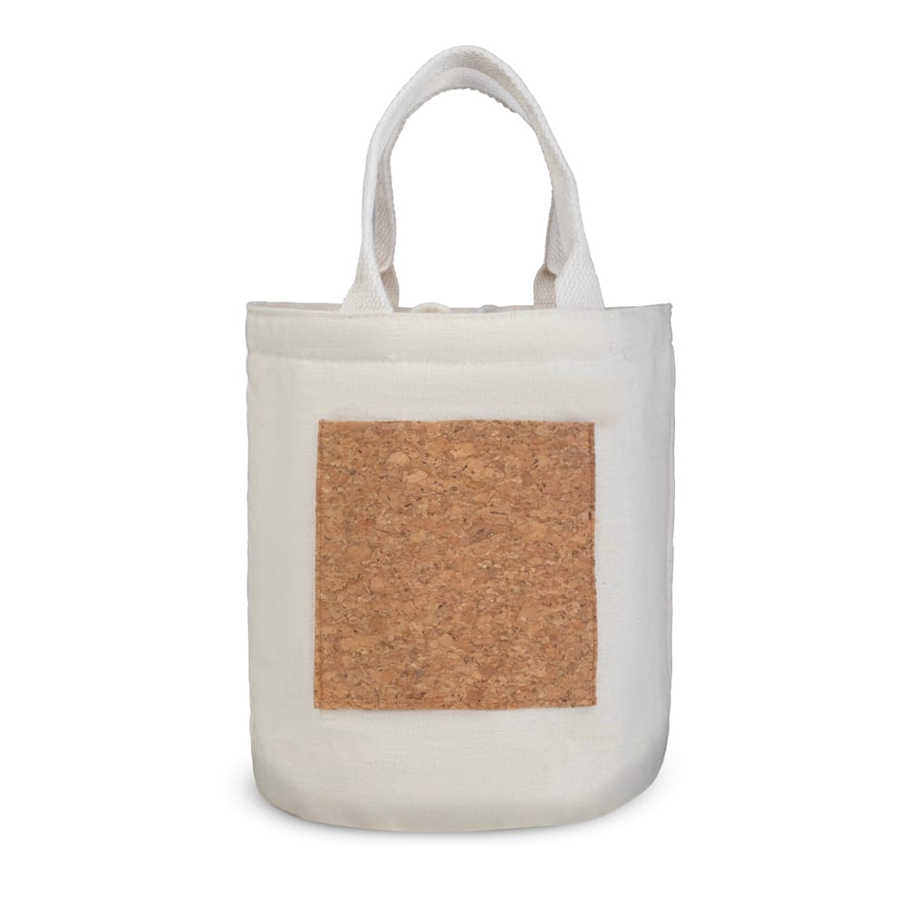 Bolsa térmica em algodão e interior costurado revestido em alumínio, bolso frontal em cortiça, alça de mão e capacidade de até 4,8L. Sistema de fechamento por meio de cordão.