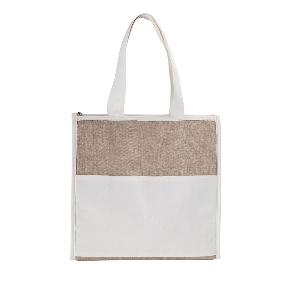 Bolsa térmica em Juta sintética e bolso em algodão. Interior costurado revestido em alumínio, alça de mão e capacidade de até 18L. Sistema de fechamento por meio de zíper.