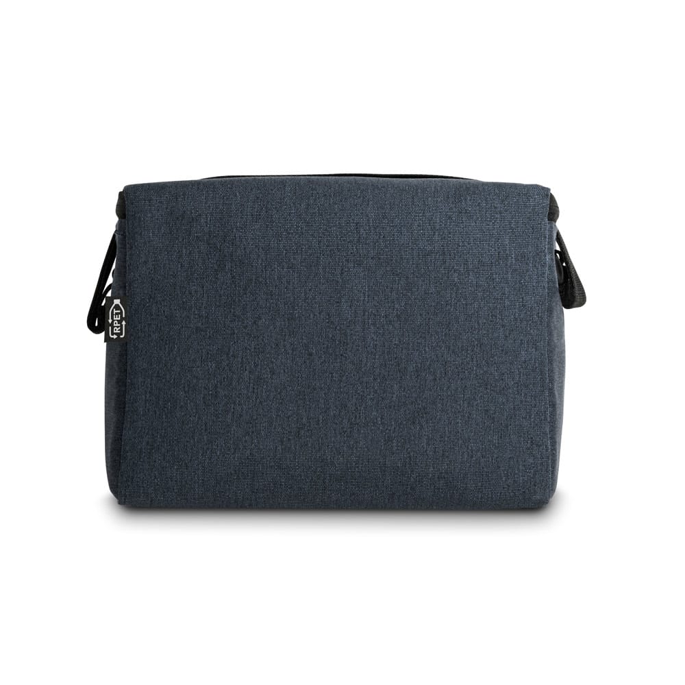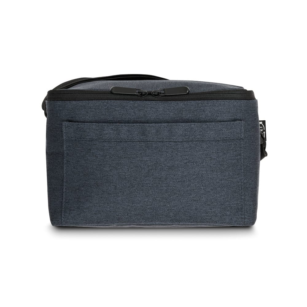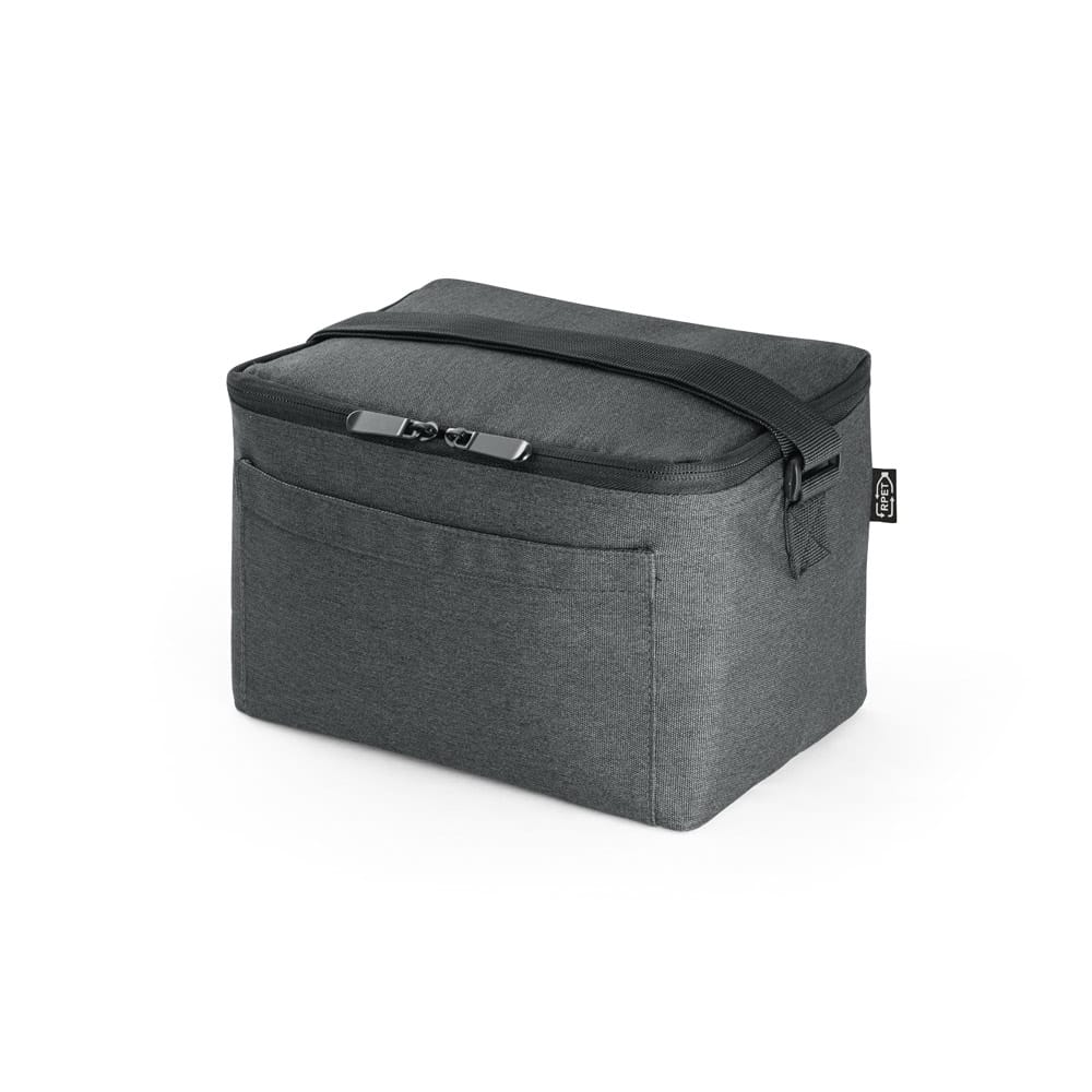 Bolsa térmica em poliéster reciclado Oxford com interior em PEVA. Alça ajustável em webbing, bolso frontal e fecho duplo. Capacidade até 6L. Certificação EU Food Grade