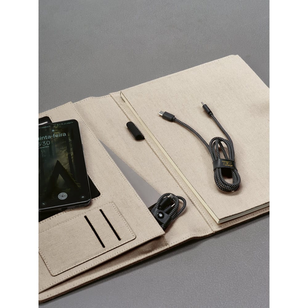 Cabo USB-C de carregamento rápido em PET 100% reciclado. Potência de entrada e saída de 3A. Incluso correia para organizar o cabo à sua maneira. Fornecido em caixa presente de papel kraft reciclado