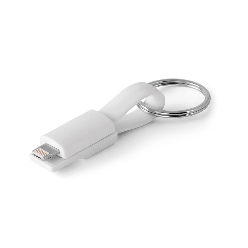 Cabo USB com conetor 2 em 1. Cabo em ABS e PVC, adequado para carregar dispositivos móveis. Compatível com entradas micro USB e sistema operativo iOS. O cabo personalizável contém uma argola chaveiro