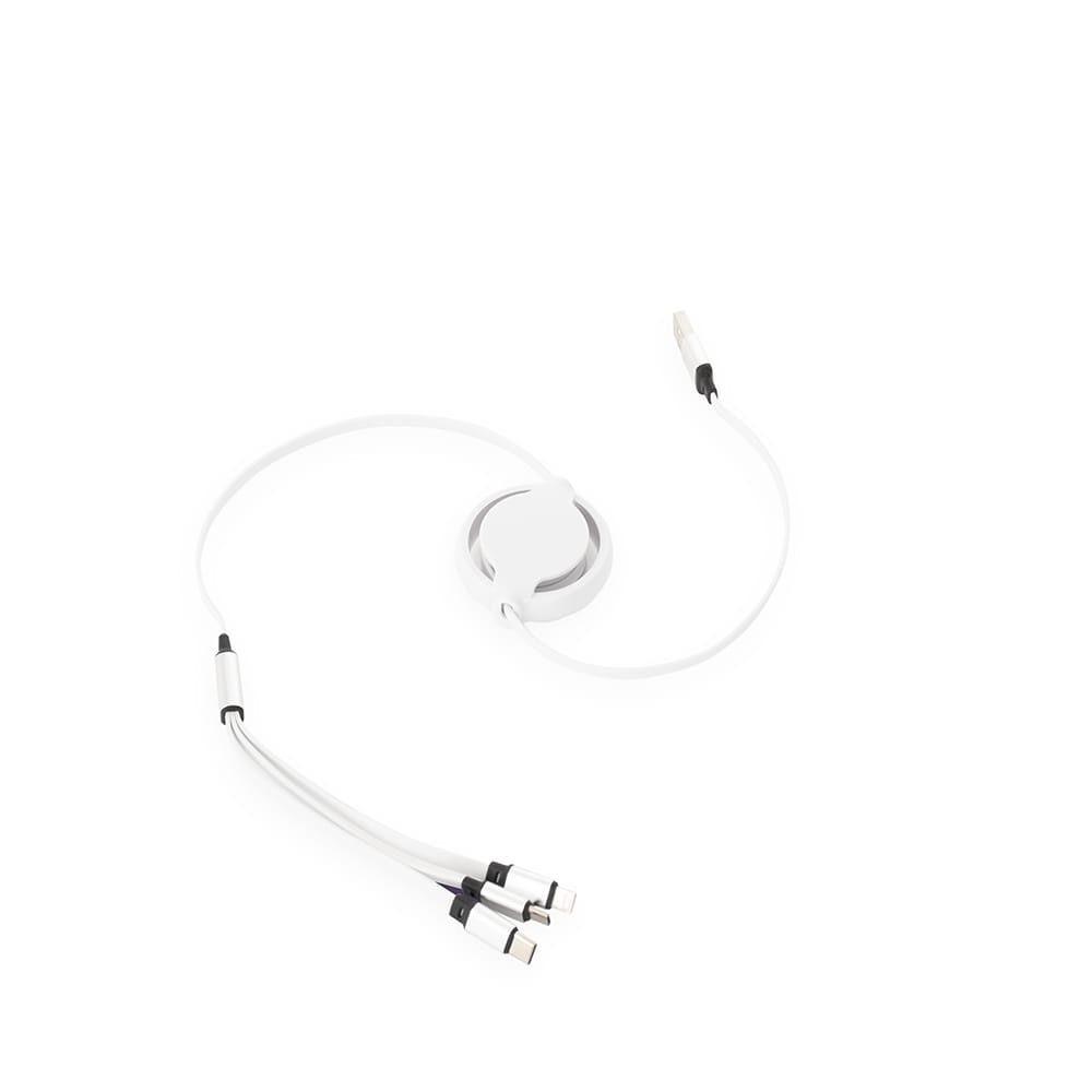 Cabo USB retrátil 3 em 1 com extensão máxima de 1m. Possui conectores USB-C, Micro USB e Lightning em uma extremidade e conector USB-A na outra. Observação: cabo destinado apenas à recarga; não realiza transferência de dados.