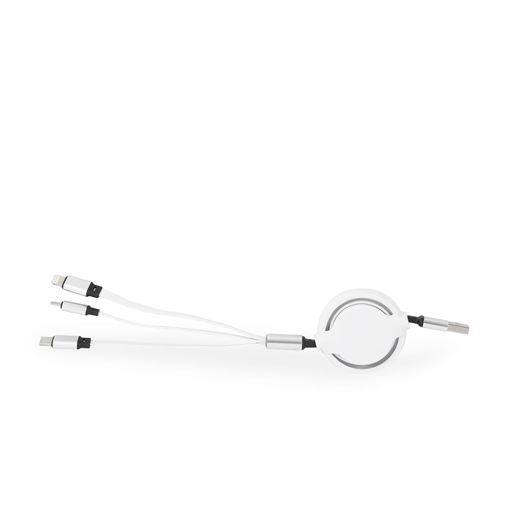 Ofereça um brinde corporativo que resolve um problema real do dia a dia: carregar múltiplos cabos para dispositivos diferentes. O cabo USB retrátil 3 em 1 personalizado atende smartphones e tablets com conectores USB-C, Micro USB e Lightning em um único acessório compacto e organizado. Com a White Brindes, você aprova o layout virtual antes da produção e pode conferir o produto no nosso showroom em Joinville.