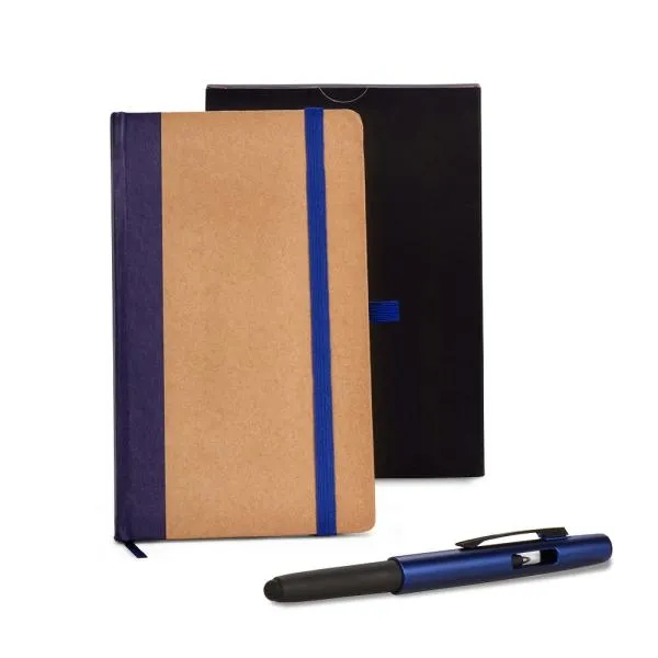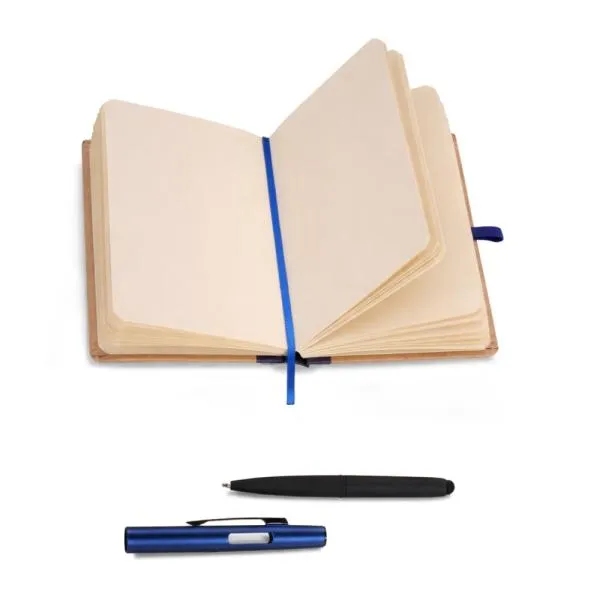 Caderno para anotações azul com capa dura e caneta em alumínio azul.