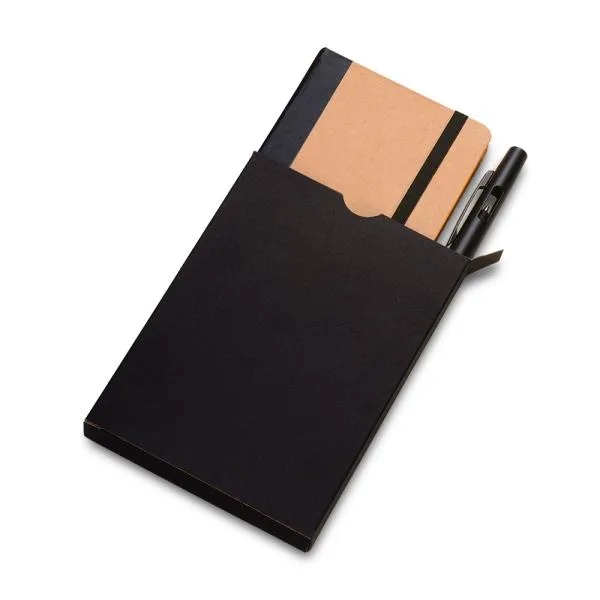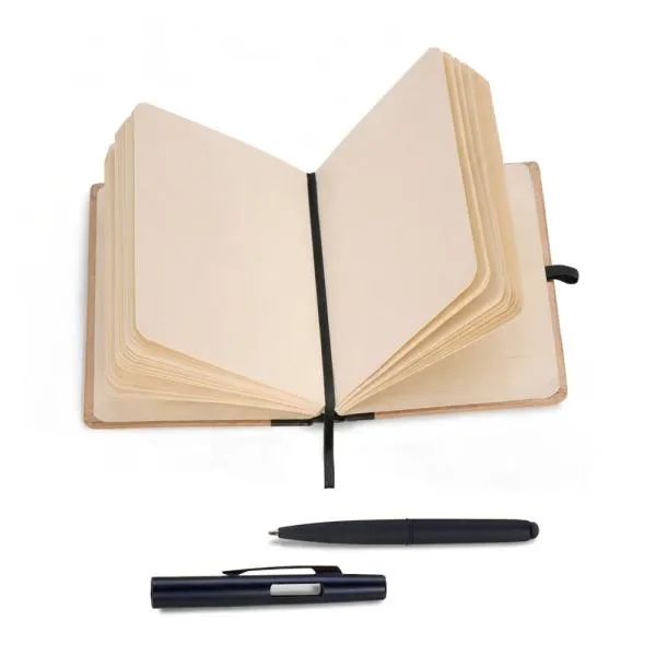 Caderno para anotações com capa dura nas cores Preto/Bege e caneta em ABS preta.