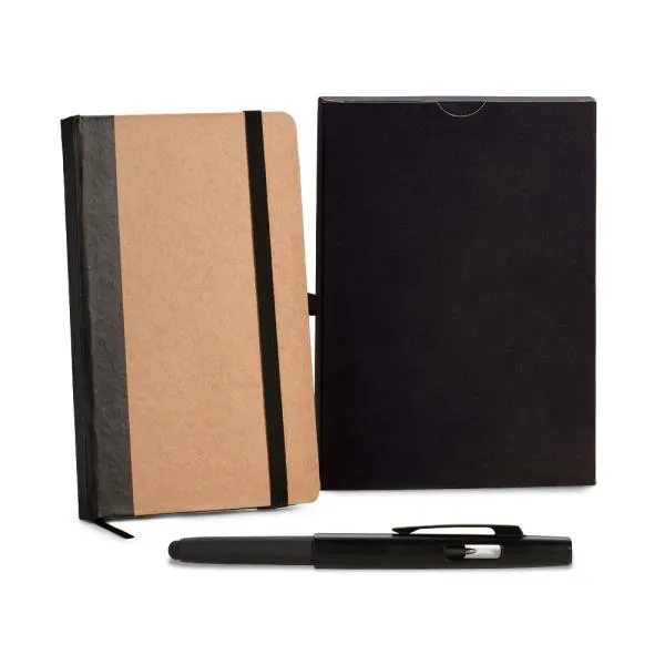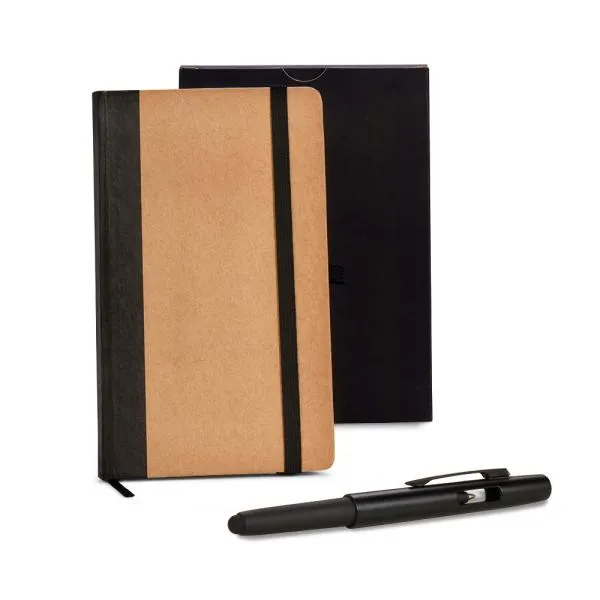 - Cores: Caderneta com capa dura nas cores bege e preto; caneta em ABS preta