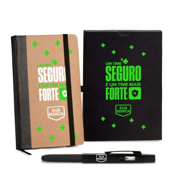 - Personalização completa no kit: A gravação é aplicada tanto na caderneta quanto na caneta, ampliando a presença da sua marca no conjunto