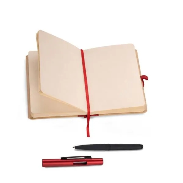 Caderno para anotações com capa dura nas cores Vermelho/Bege e caneta em ABS vermelho.