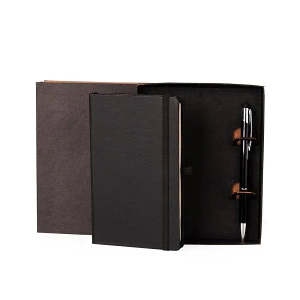 - Gravação: Silkscreen na capa da caderneta e no corpo da caneta