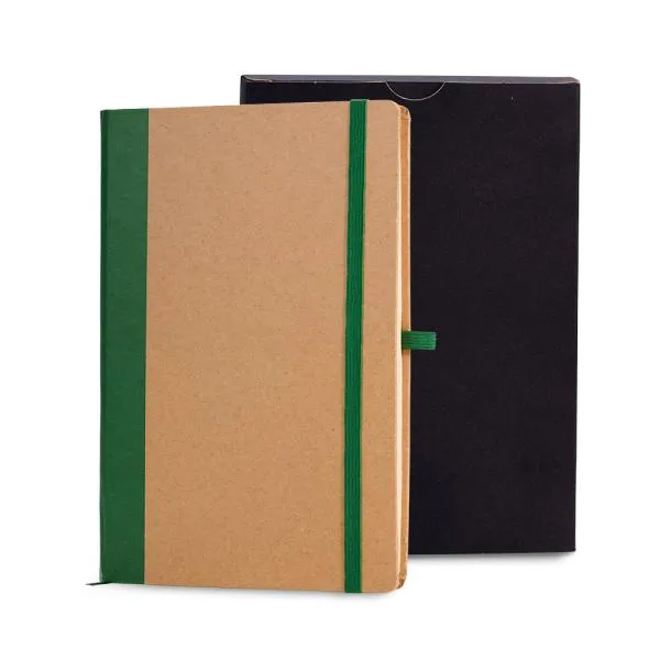 Caderno para anotações com capa dura nas cores Verde/Bege.