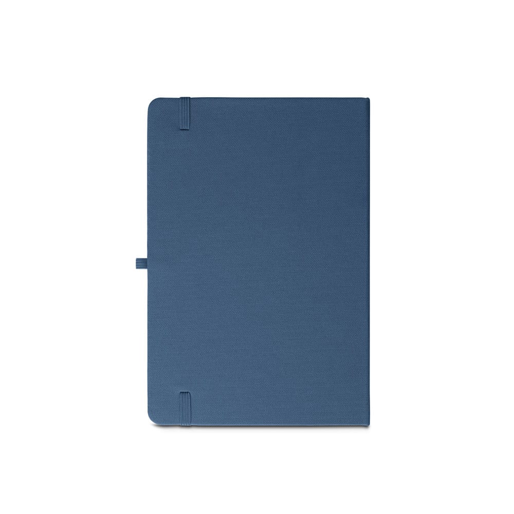 Caderno A5 de capa dura em PET 100% reciclado (rPET) Poliéster, com cantos redondos. Contém 160 páginas, em papel 100% reciclado, pautadas cor de marfim, fita separadora, suporte para Caneta (não inclusa) e elástico para fecho do caderno. Na parte inferior da lombada, tem impresso em branco o símbolo do rPET