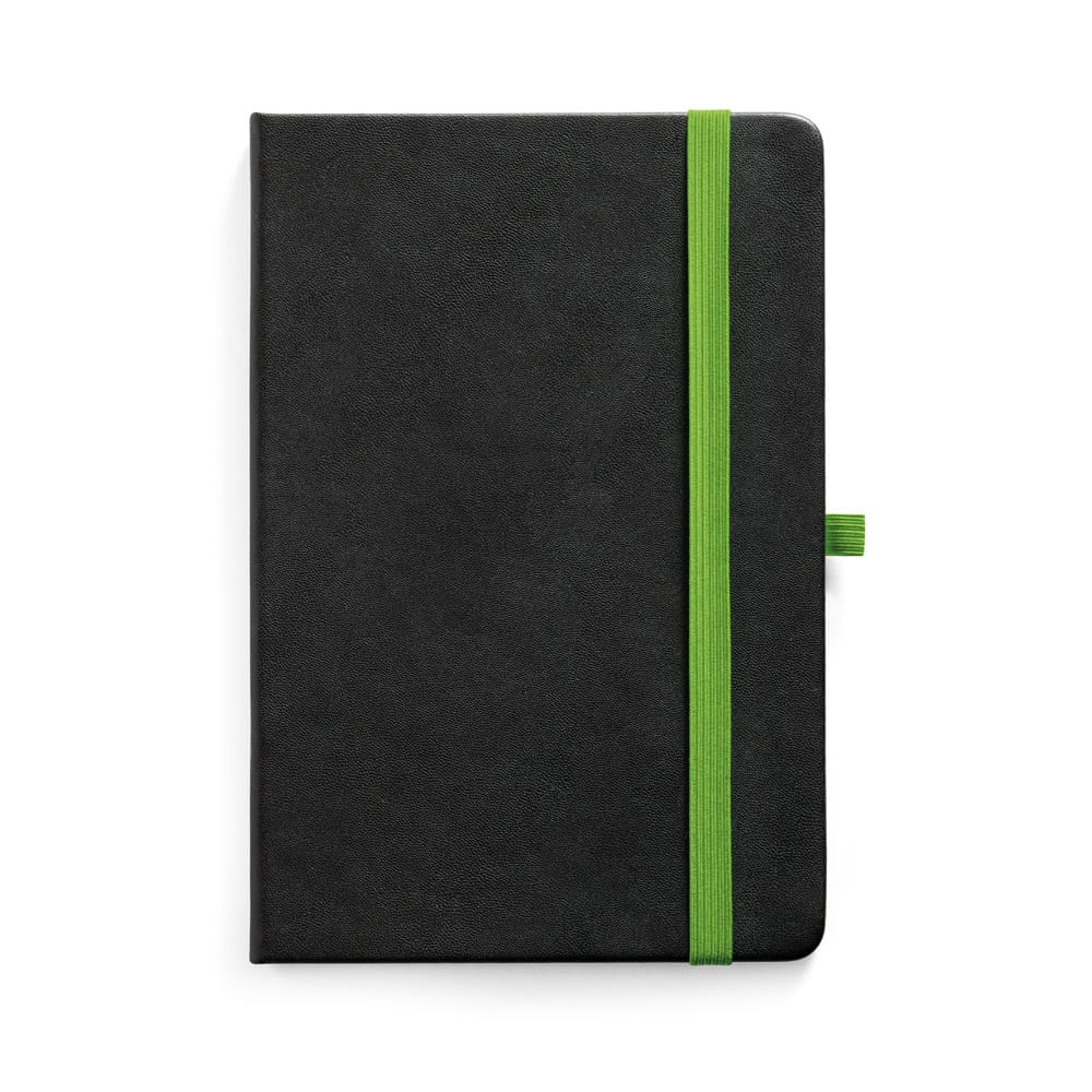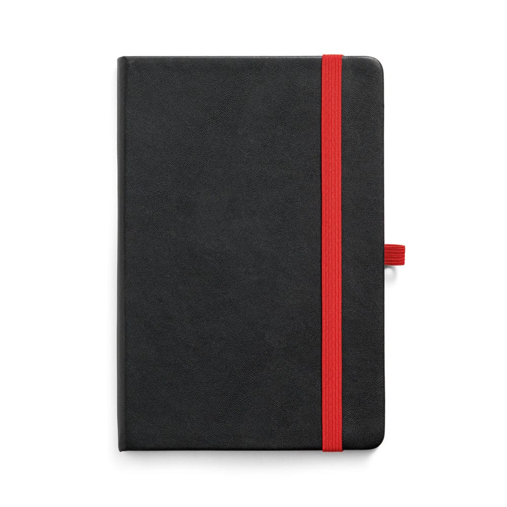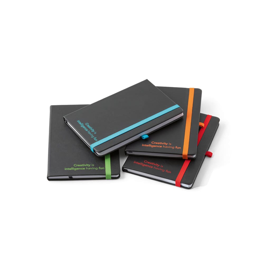 Caderno A5 de capa dura em PU com substrato colorido permitindo a gravação a laser da cor do elástico. Contém 160 páginas pautadas, elástico, fita separadora, suporte para Caneta (não inclusa) e bolso em papel na parte traseira da capa