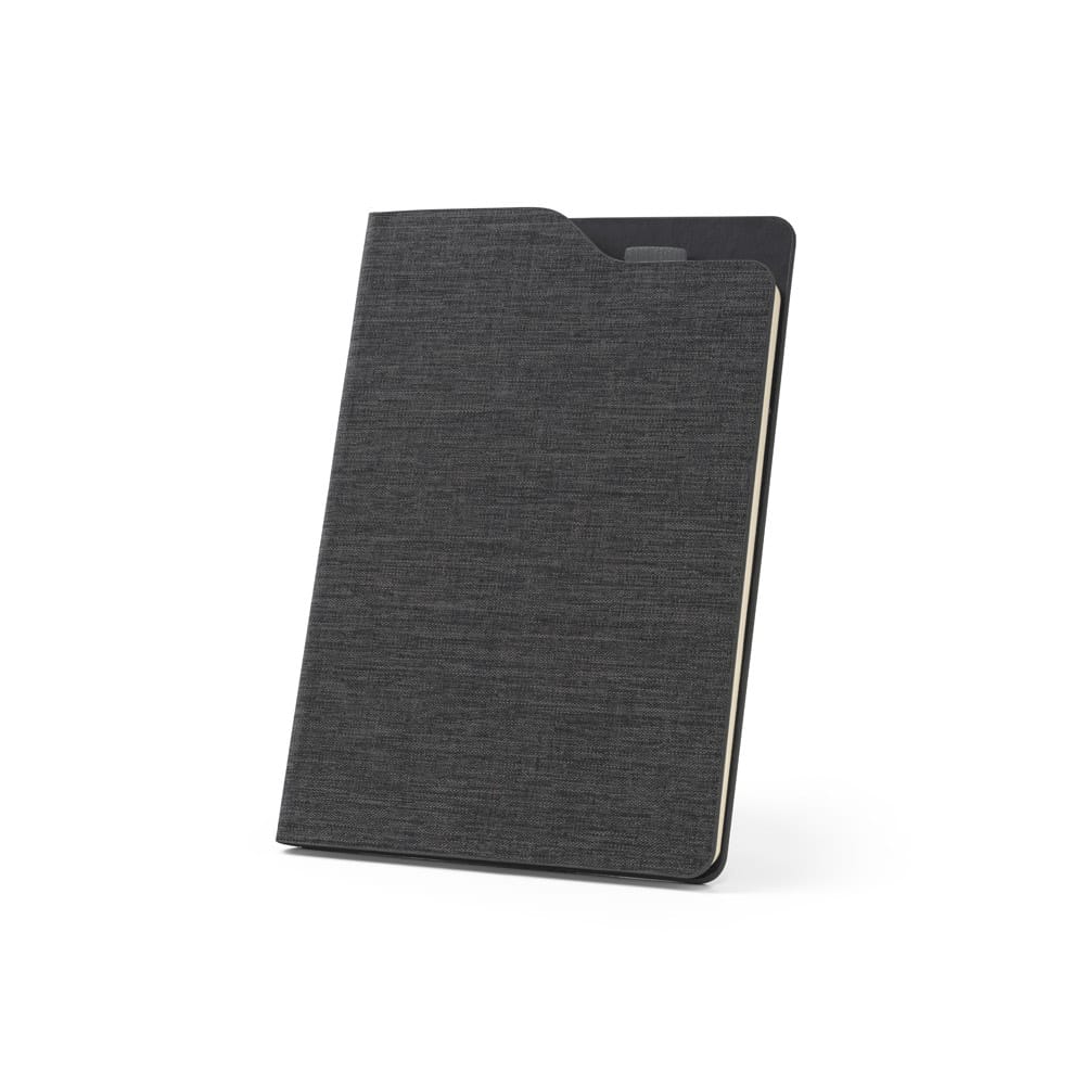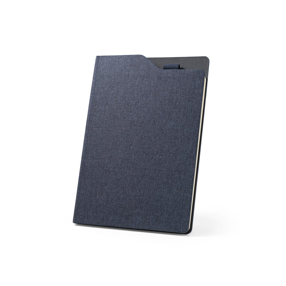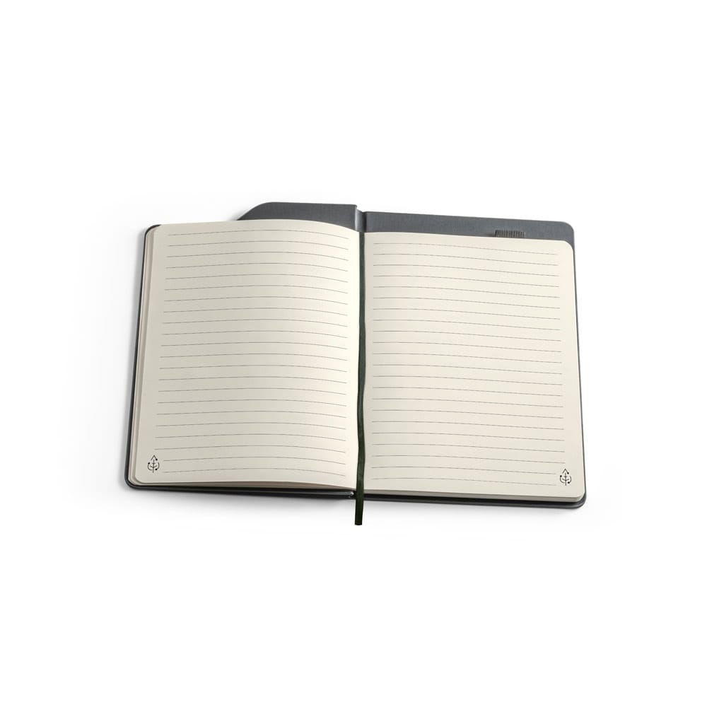 Caderno A5 de capa dura em tecido PET 100% reciclado (rPET). Contém 160 páginas pautadas em papel cor marfim 100% reciclado, fita separadora e suporte de esferográficas no topo do caderno (não inclusa)