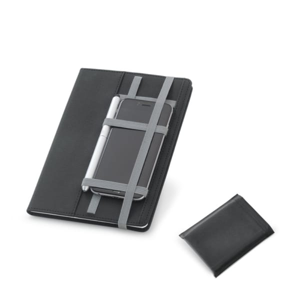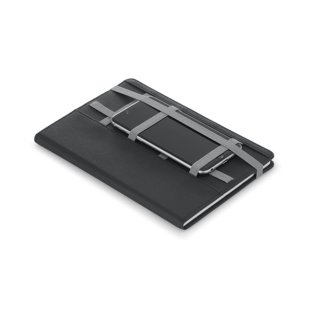 Caderno A5 de capa dura em c. sintético, com 160 páginas lisas. Contém elásticos com capacidade para suportar Caneta (não inclusa), celular e cartões e um elástico para fechar o bloco de notas. Fornecido em bolsa de non-woven
