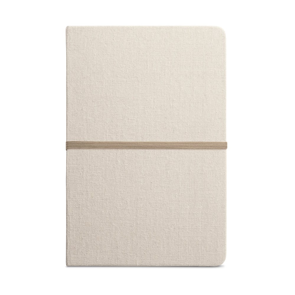 Caderno A5 de capa dura em linho (230 g/m²), com cantos redondos. Contém 192 páginas pautadas e elástico na horizontal para fecho do caderno