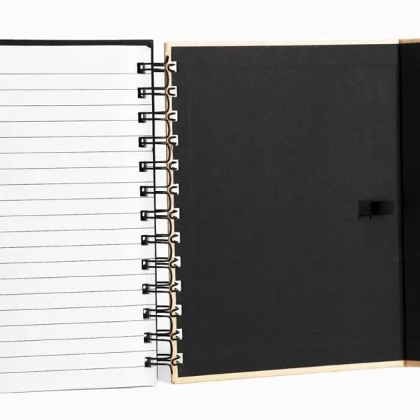 Caderno espiral preto/bege com capa e caneta em Papelão Reciclado rígido, 70 folhas pautadas. Fechamento através de imã na aba.