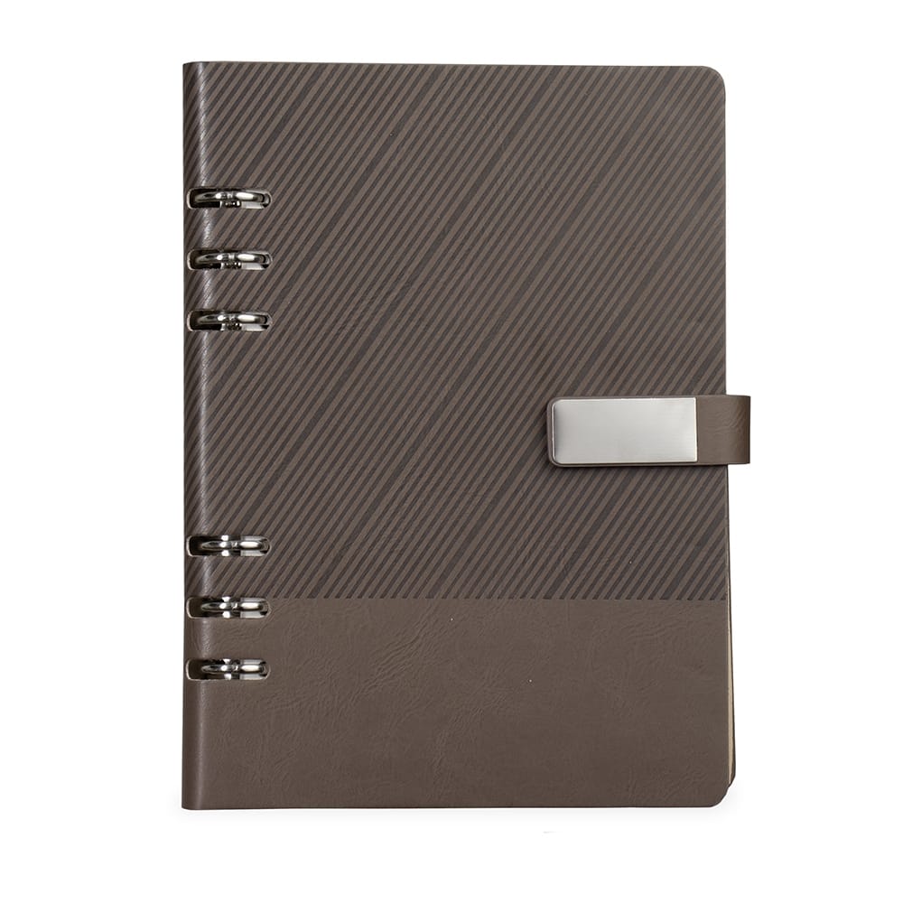 Caderno tipo fichário com capa dura texturizada em couro sintético, fecho magnético e plaquinha metálica fixa à aba. Possui mecanismo de argolas em aço carbono com abertura facilitada e parte interna da capa com compartimento para três cartões, porta-caneta e visor em plástico transparente para documentos. Conta ainda com aproximadamente 80 folhas tamanho A5 pautadas em marfim com espaço para assinalar dias da semana e datas numéricas.