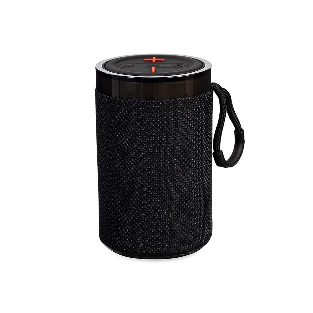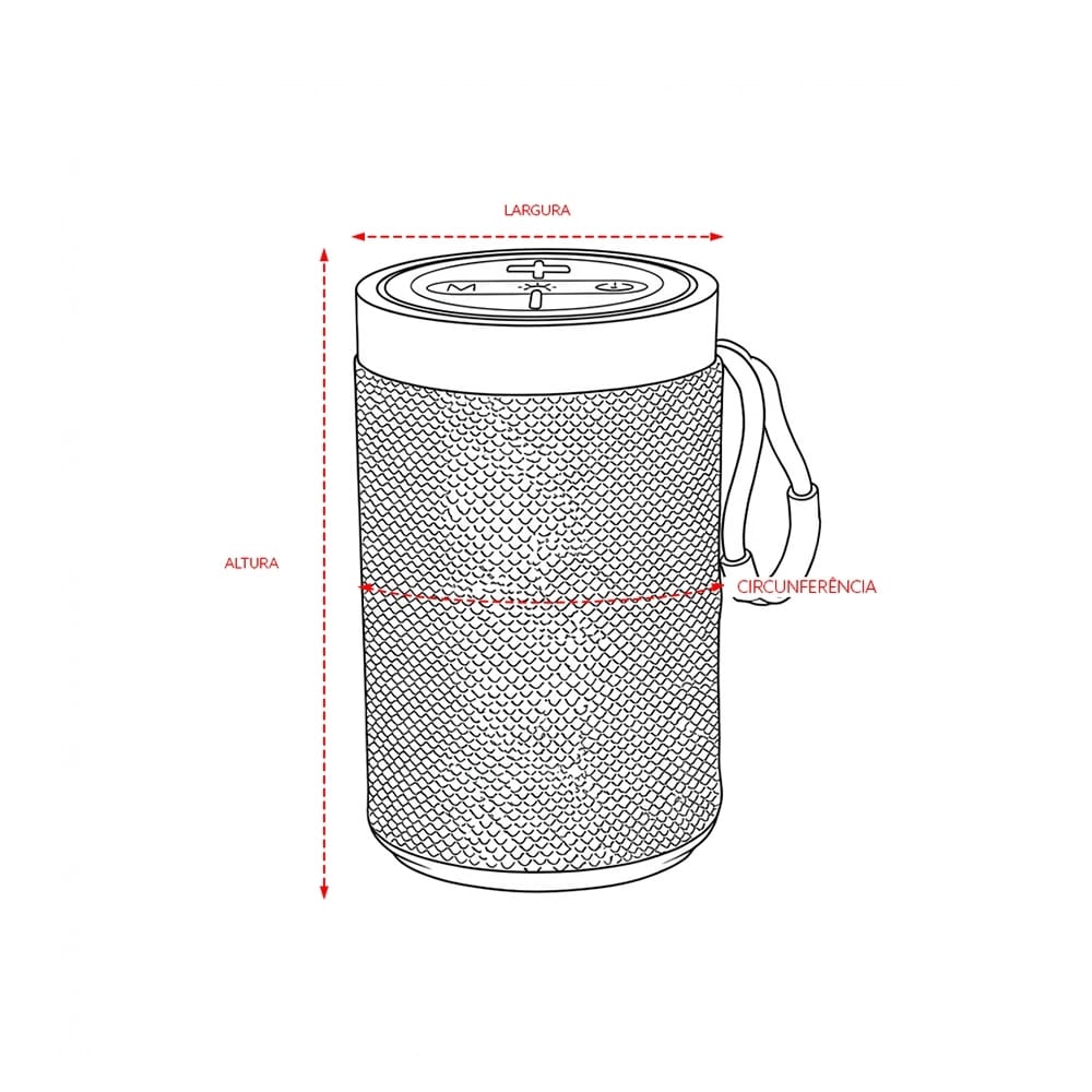 Caixa de som multimídia em plástico ABS, revestimento em malha de poliéster, painel de botões em silicone, iluminação RGB ajustável, alça em nylon com proteção emborrachada e base antiderrapante. Apresenta conexão Bluetooth 5.3, rádio FM e tecnologia TWS, que permite sincronizar duas caixas simultaneamente. Conta ainda com entradas USB-A e TF para reprodução de arquivos MP3 via pen drives e cartões microSD, além de conexão USB-C para recarga. Acompanha cabo USB-C.