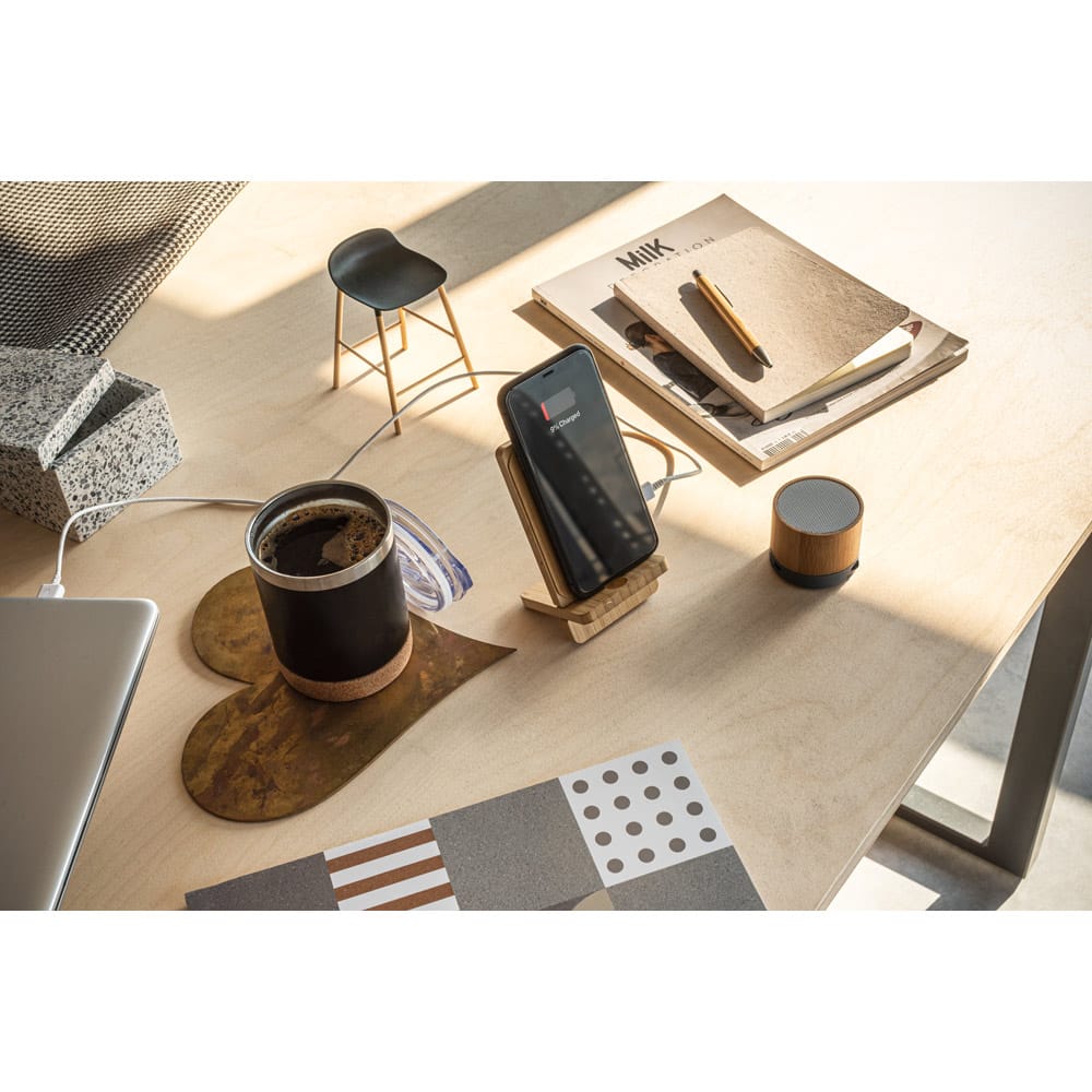 Caixa de som portátil com microfone, em bambu e ABS 100% reciclado, com transmissão sem fios BT 5.3. Tem potência de 3W, bateria com 400 mAh e autonomia aproximada de 4h30. Permite ainda as funções de atender chamadas, leitor de cartões microSD, entrada AUX e reprodução automática via porta USB-A. Incluso cabo de carregamento USB-C. Fornecido em caixa presente de papel kraft reciclado, que pode ser reutilizada como suporte de celular. A grelha é fornecida solta para pedidos não personalizados. A cor e o resultado da impressão nos materiais naturais pode variar entre produtos
