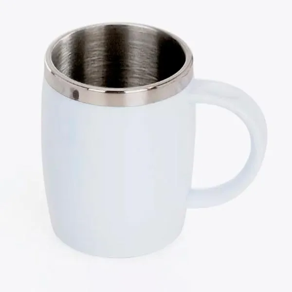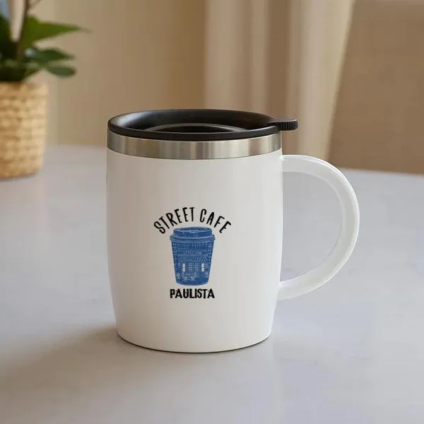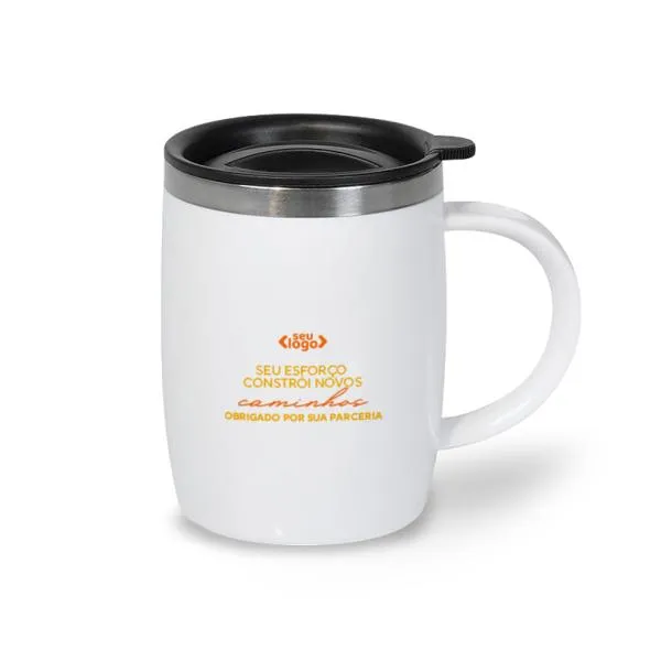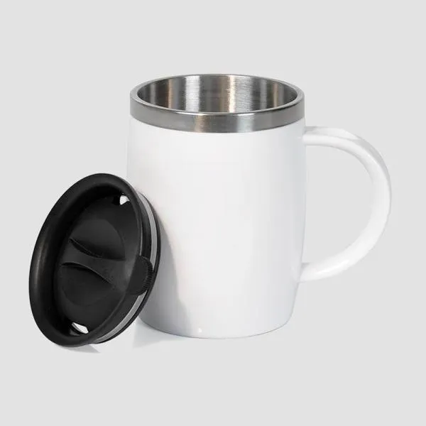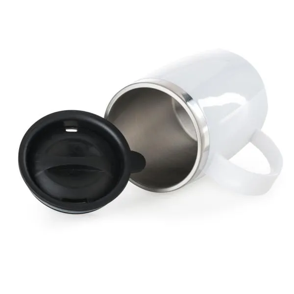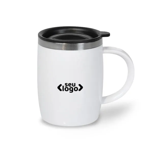 Caneca em Aço Inox com revestimento de Poliestireno branco e tampa em Polipropileno.