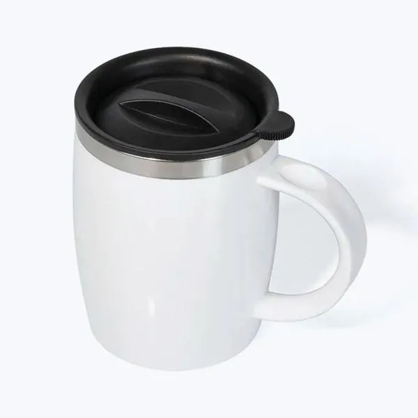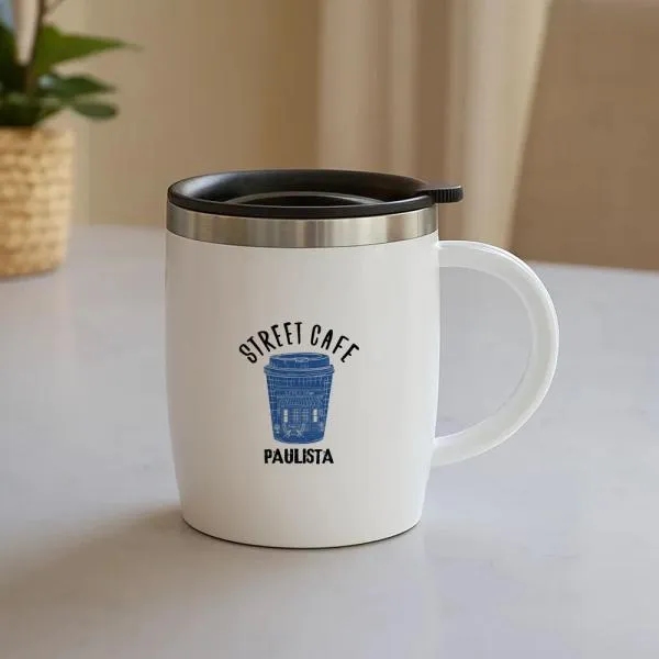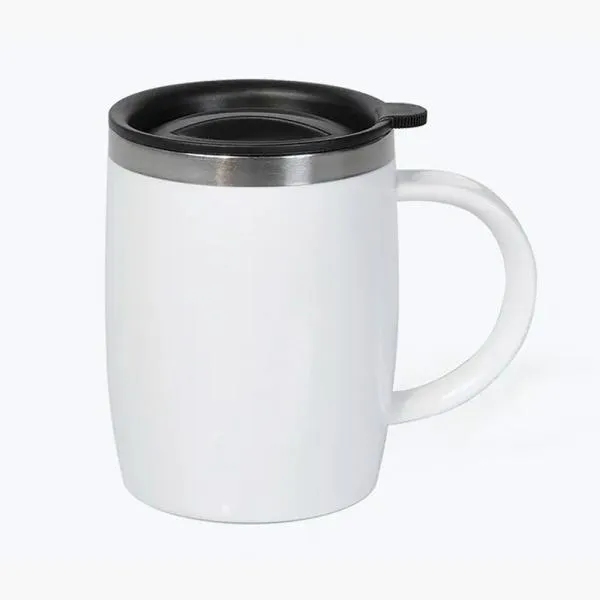 Caneca em Aço Inox com revestimento de Poliestireno branco e tampa em Polipropileno.