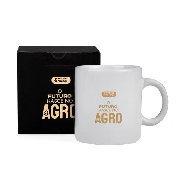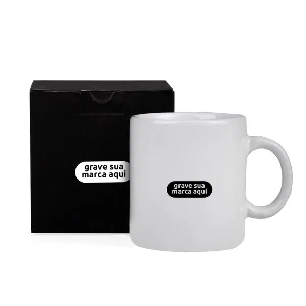- Gravação: Silk screen aplicado na caneca e na embalagem