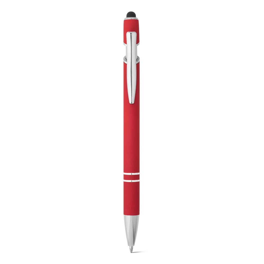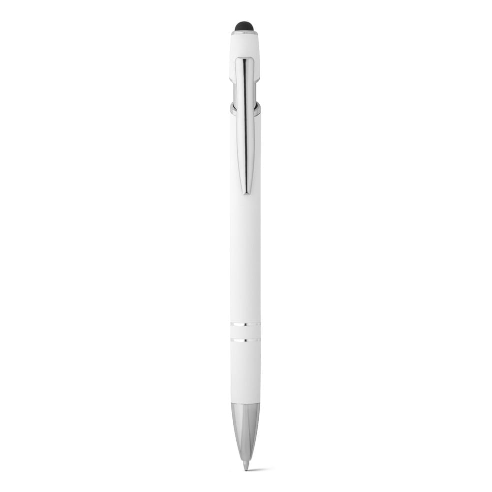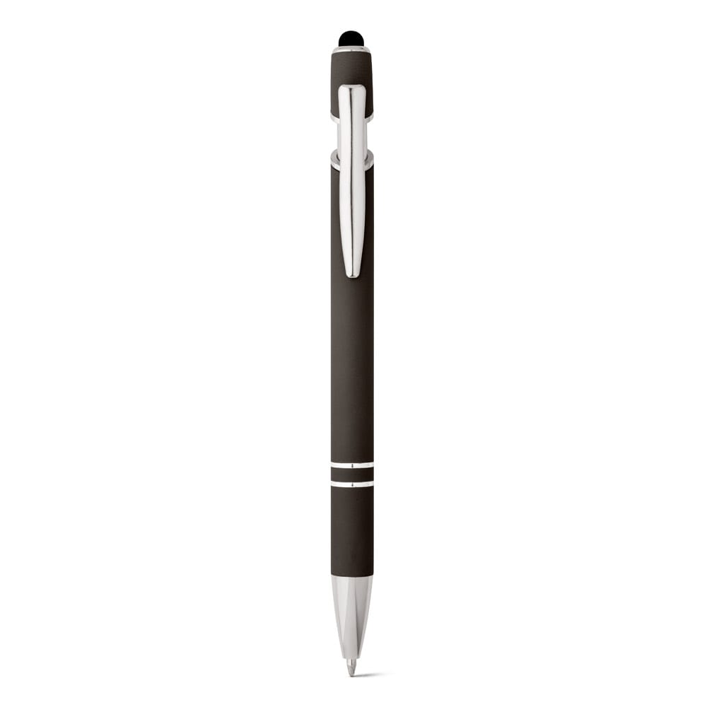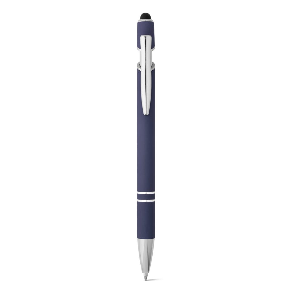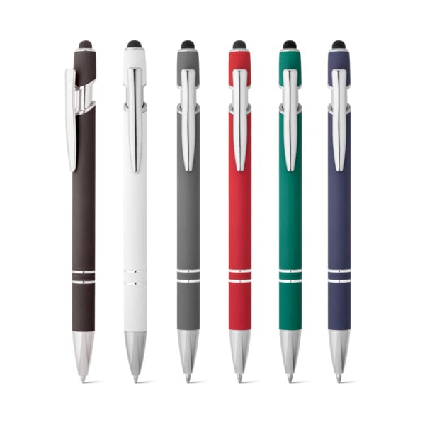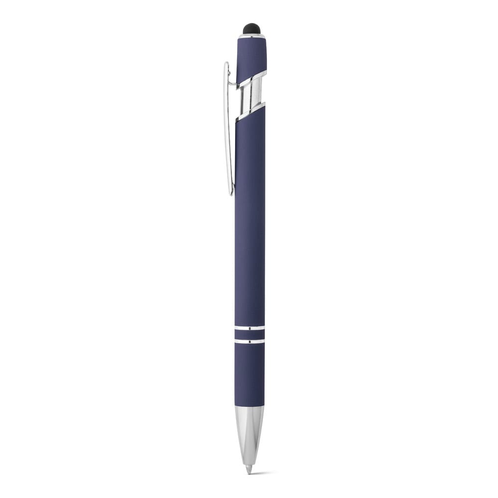 Caneta em alumínio com acabamento emborrachado. A Caneta tem clipe em metal, ponteira touch no topo e escrita em azul até 1,5 km