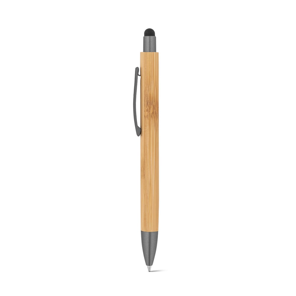 Caneta em bambu com clipe em metal e acabamento mate. A Caneta tem ponteira touch e escrita em preto até 1,5 km. A cor e o resultado da impressão nos materiais naturais pode variar entre produtos