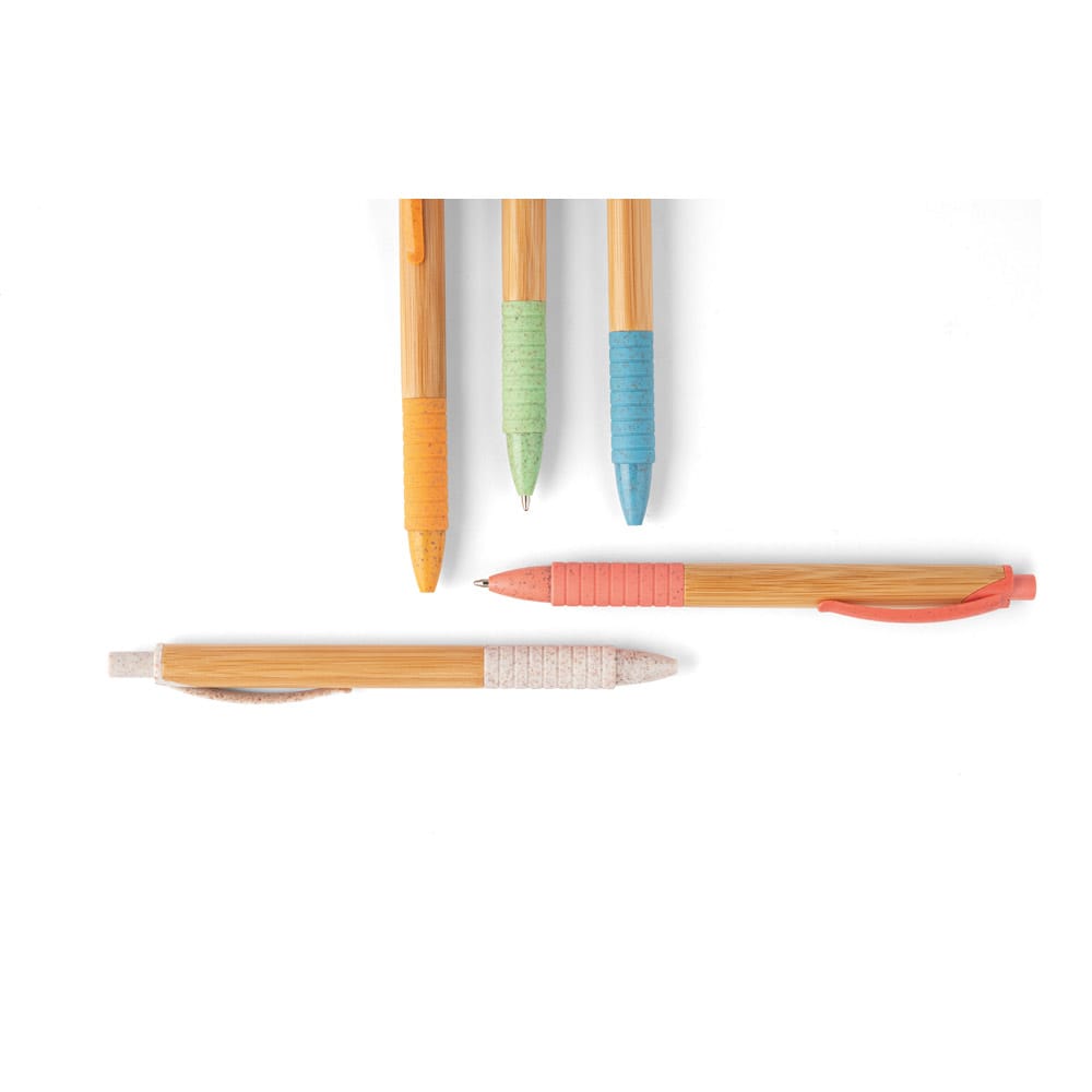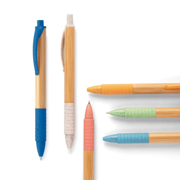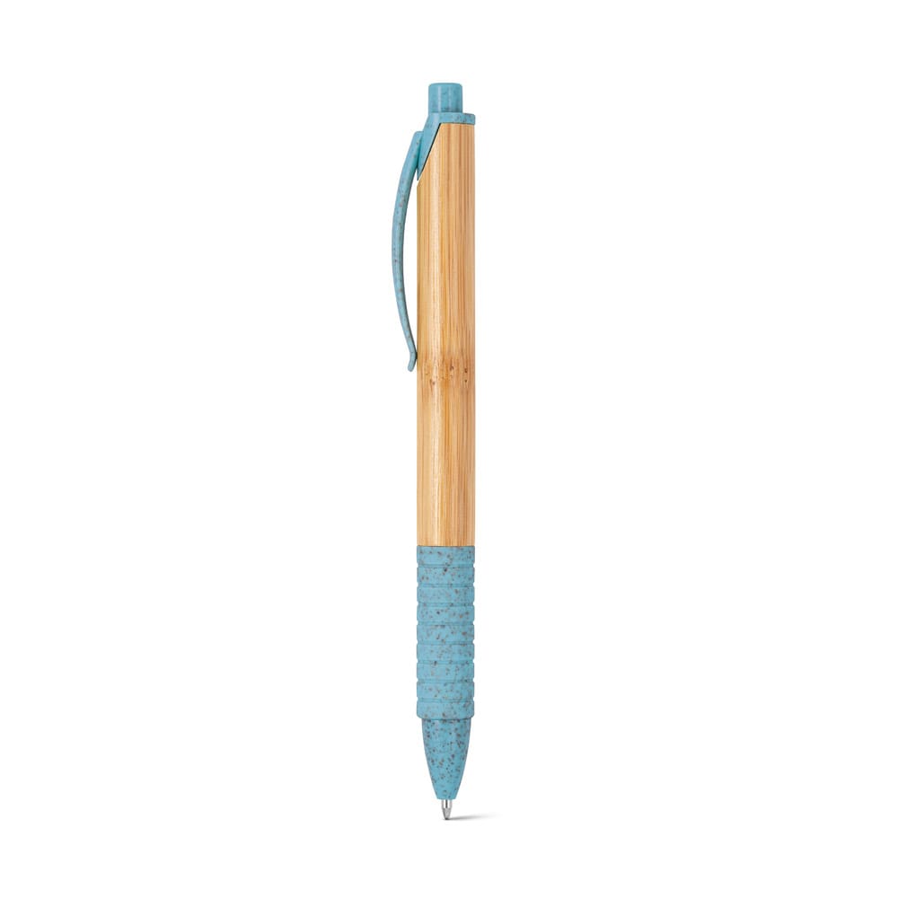 Caneta em bambu com clipe, antideslizante e elementos coloridos em fibra de trigo e ABS. Escrita em azul. A cor e o resultado da impressão nos materiais naturais pode variar entre produtos
