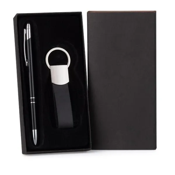 Caneta e chaveiro em metal. Composto por caneta em alumínio preto e chaveiro em metal e material sintético preto.