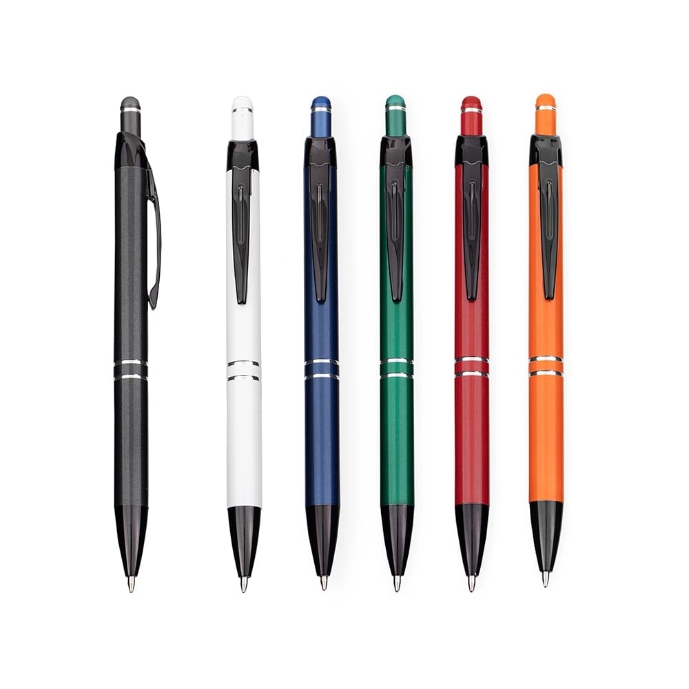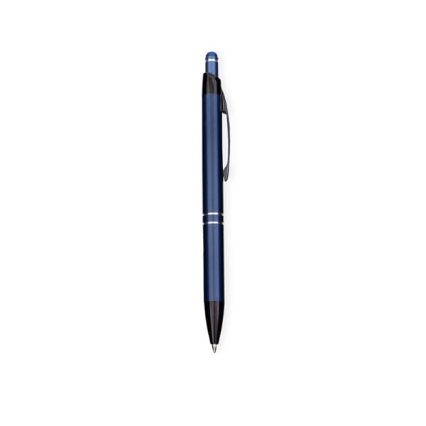 Caneta em metal com clip e ponta em plástico, além de detalhe emborrachado no topo para interação com dispositivos de telas sensíveis ao toque. Conta ainda com acionamento por clique e carga esferográfica azul de 1,0mm.