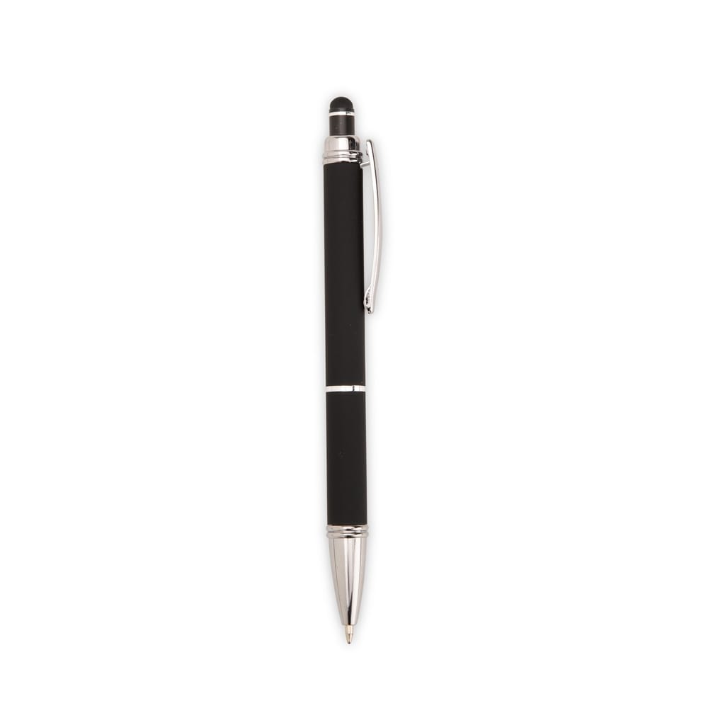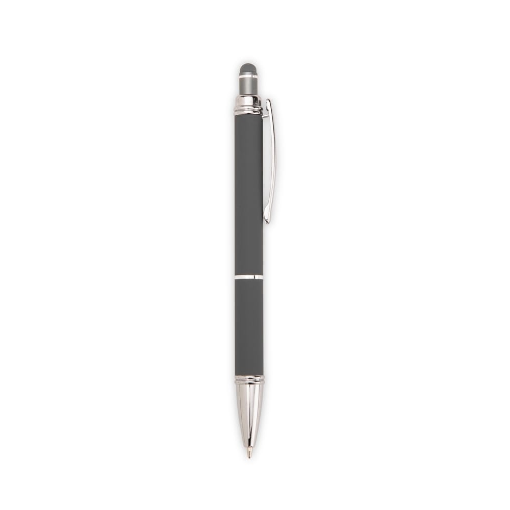 Caneta metálica com pintura de acabamento emborrachado. Possui acionamento por clique, topo emborrachado para uso em dispositivos com telas sensíveis ao toque e carga esferográfica azul de 1,0 mm.