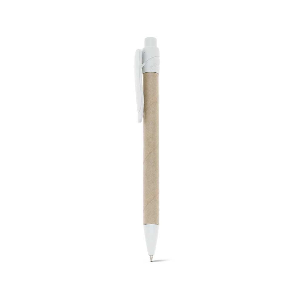 Caneta em papel kraft reciclado, com clipe de plástico. Escrita em azul até 1,5 km. A cor e o resultado da impressão nos materiais naturais pode variar entre produtos