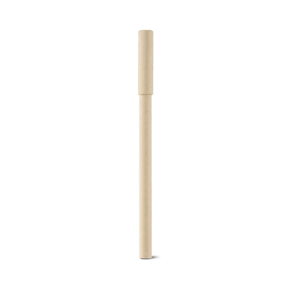 Caneta em papel kraft, com interior proveniente do reaproveitamento de papel de jornal, e tampa em papel kraft. Escrita em azul. A cor e o resultado da impressão nos materiais naturais pode variar entre produtos
