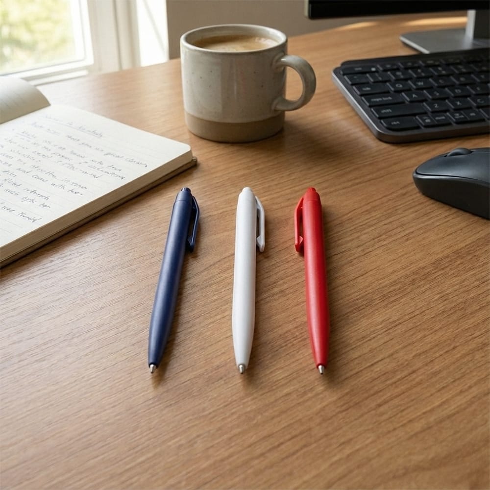- Presença constante da sua marca: Uma caneta circula por mesas, reuniões e bolsos. Sua logo aparece de forma natural e repetida no cotidiano de quem recebe, sem esforço adicional de divulgação.