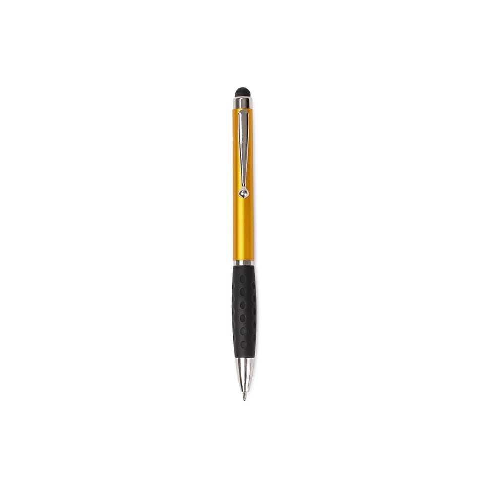 Caneta plástica com ponta, clip e pequenos detalhes em metal, além de detalhes ergonômicos na área próxima à tampa. Possui acionamento por rotação, carga esferográfica azul de 1.0mm e ponteira emborrachada para interação com dispositivos de telas sensíveis ao toque.
