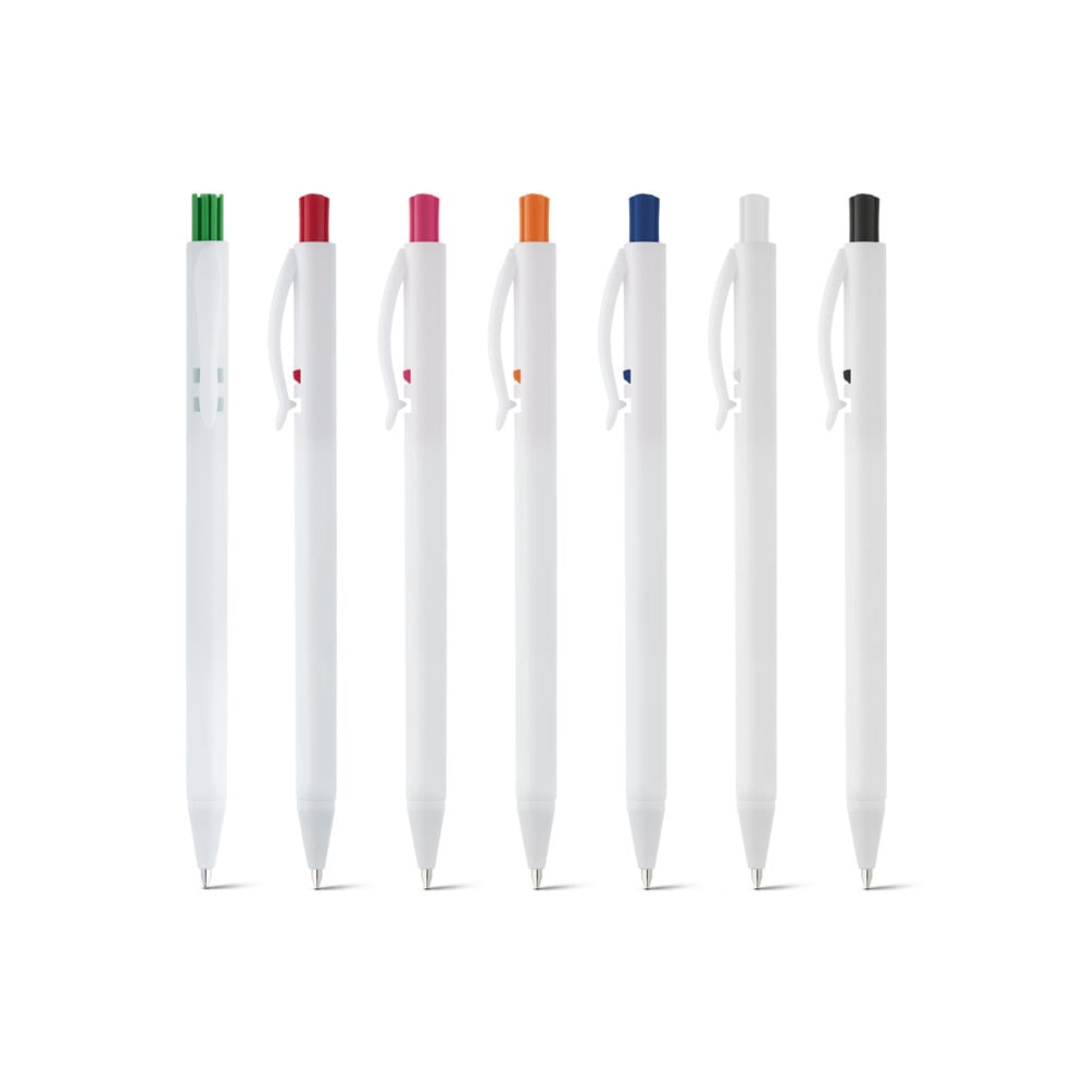 Caneta em ABS com acabamento brilhante e mecanismo colorido. Escrita em azul até 1,5 km. Produto certificado de acordo com a portaria Inmetro nº423 de 8/out/2021