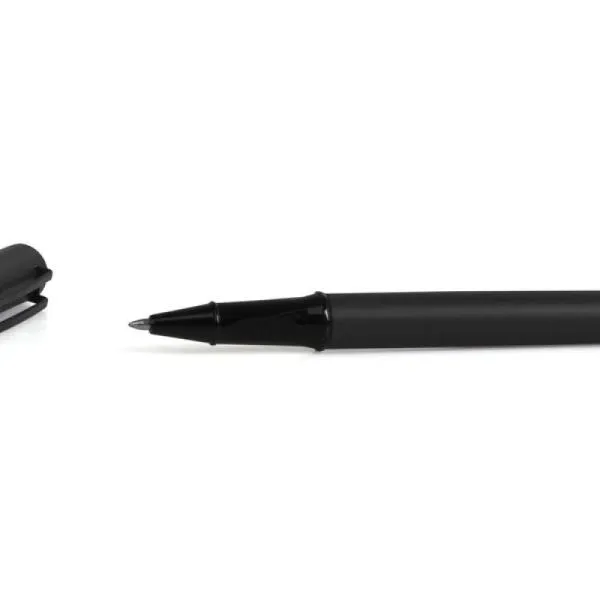 Caneta roller em alumínio com tampa preta.