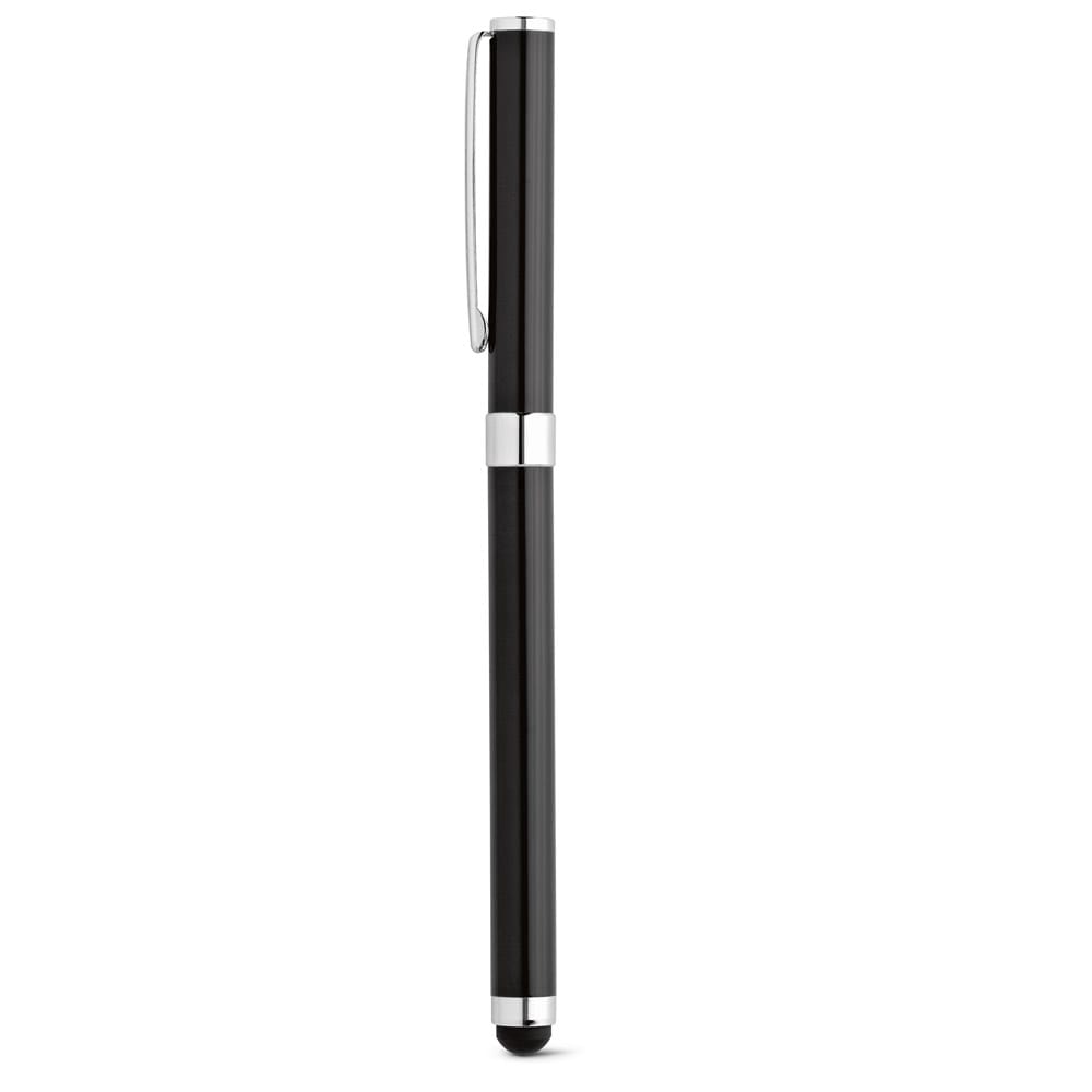 Caneta Roller em aço inoxidável com corpo brilhante e detalhes em metal cromado. O detalhe da ponteira touch torna este brinde sofisticado e adaptável às novas tecnologias. Escrita em preto. Fornecido com caixa presente desmontada