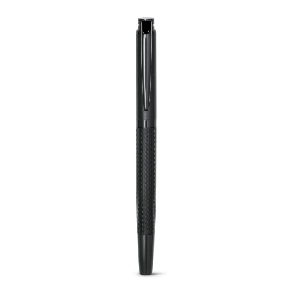 Caneta Roller em metal com suave relevo no corpo. Escrita em preto. Fornecido em estojo presente almofadado