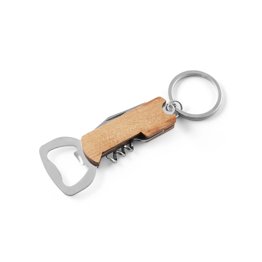 Chaveiro 3 em 1 em bambu com abridor de garrafas, saca-rolhas e canivete. A cor e o resultado da impressão nos materiais naturais pode variar entre produtos