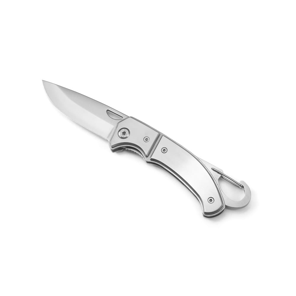 Canivete em aço inox e metal com fecho de segurança e clipe. Fornecido em caixa presente