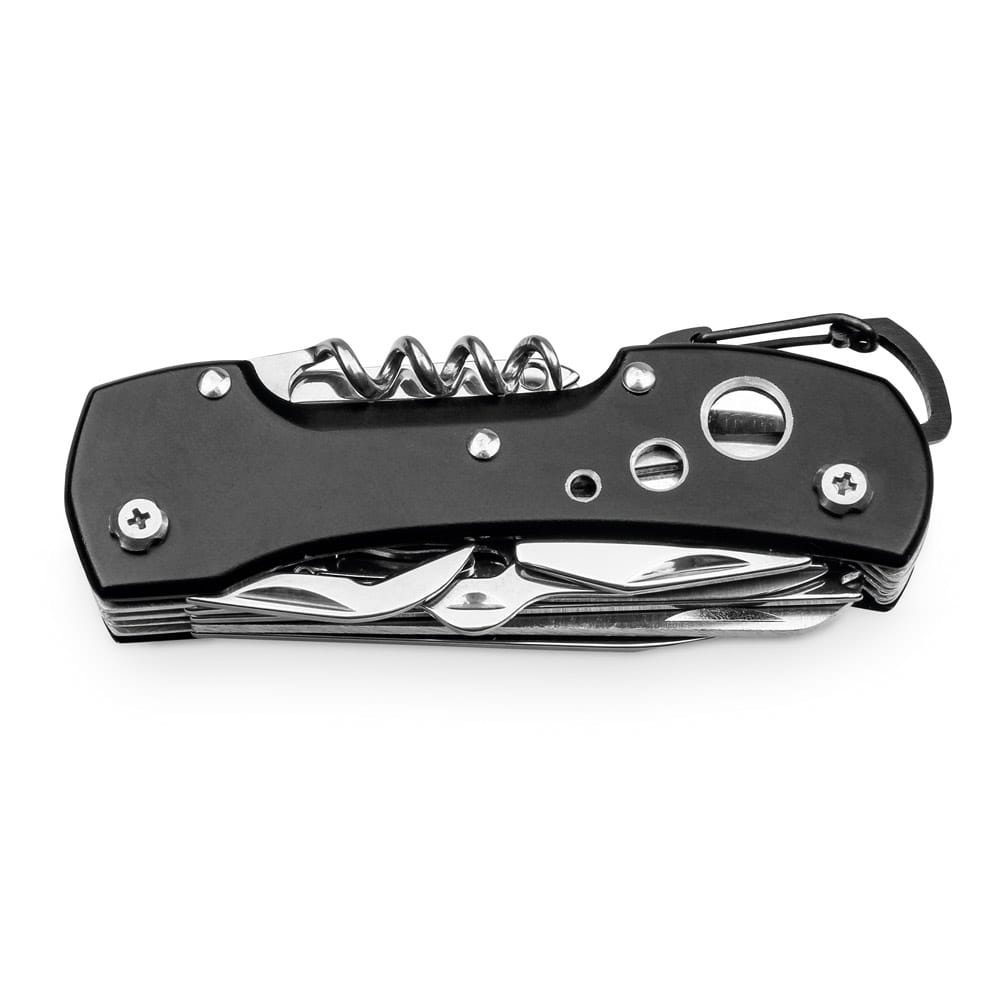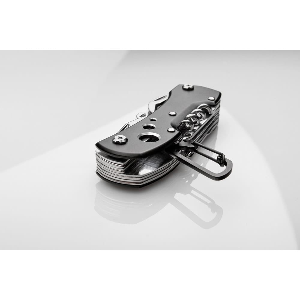 Canivete multifunções em aço inox com 12 peças e mosquetão. Fornecido em caixa presente