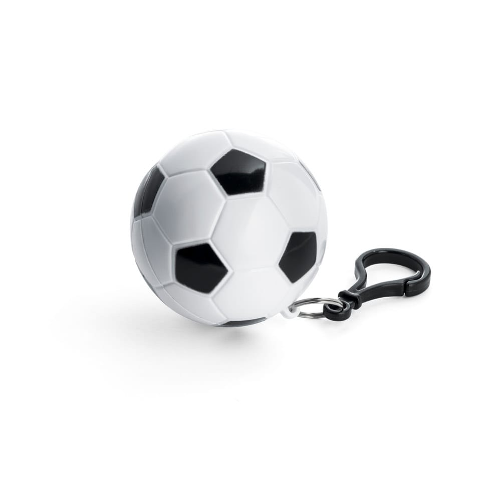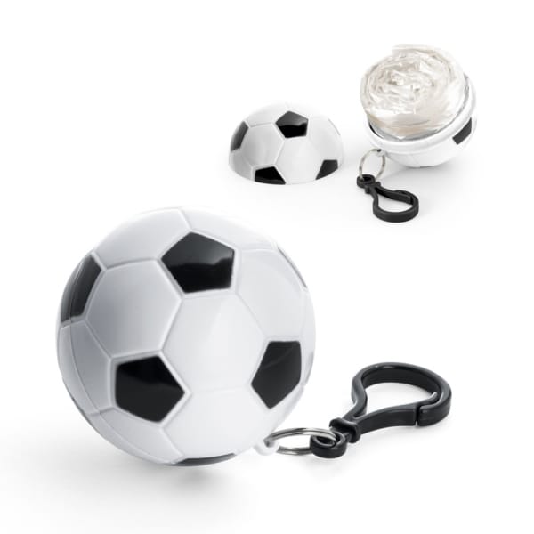Capa de chuva de tamanho único fornecida dentro de embalagem em formato de bola de futebol, com chaveiro e mosquetão