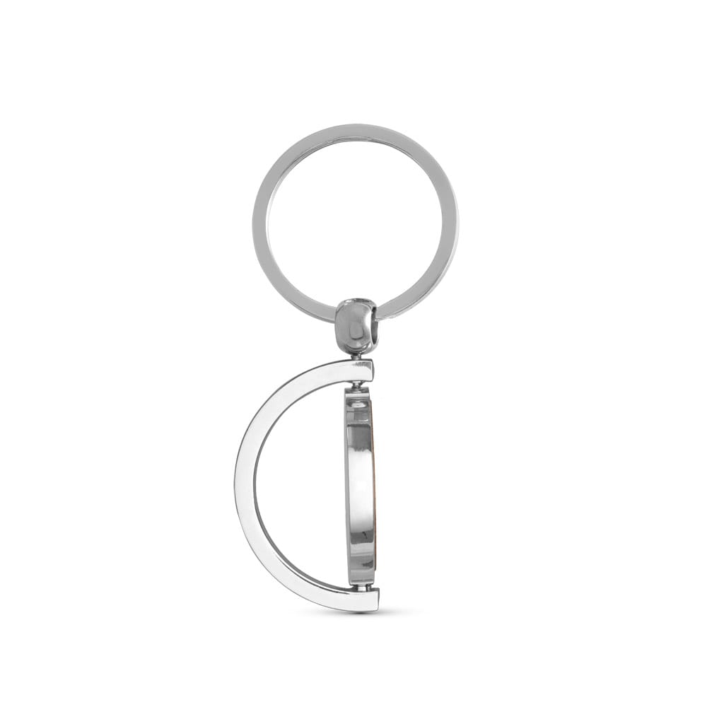 Chaveiro redondo em bambu com revestimento em metal. Fornecido com bolsa em cartão kraft. A cor e o resultado da impressão nos materiais naturais pode variar entre produtos